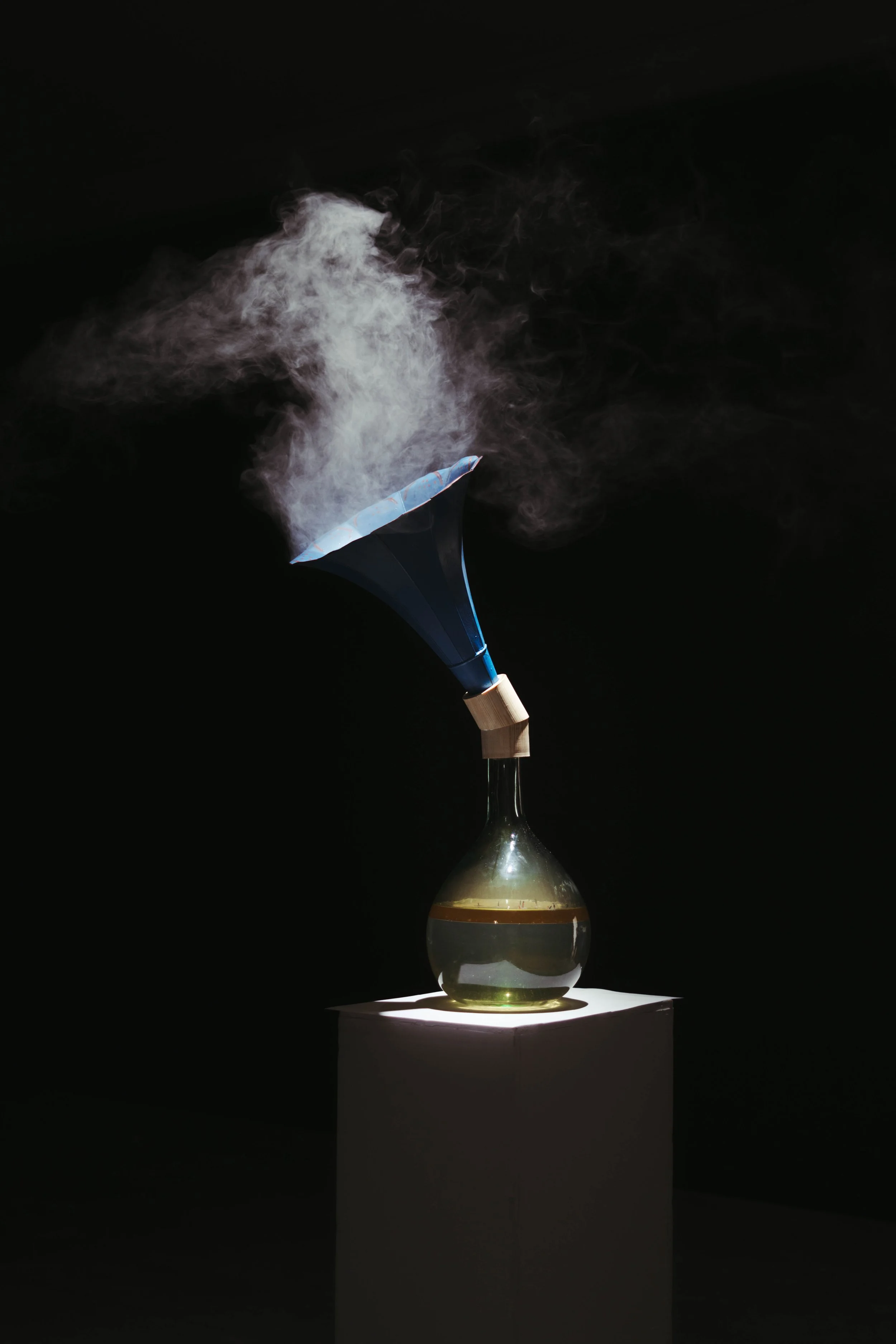 Glass bottle, water, olive oil, cotton, gramophone horn, smoke machine, variable dimensions
